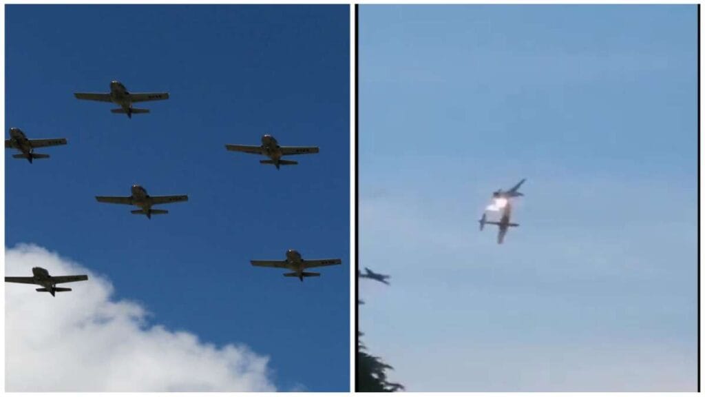 En redes sociales, se han compartido videos grabados por personas que veían el entrenamiento en tierra; mostraron el momento en que dos aviones se tocan en el aire y uno envuelto en llamas cae a tierra.