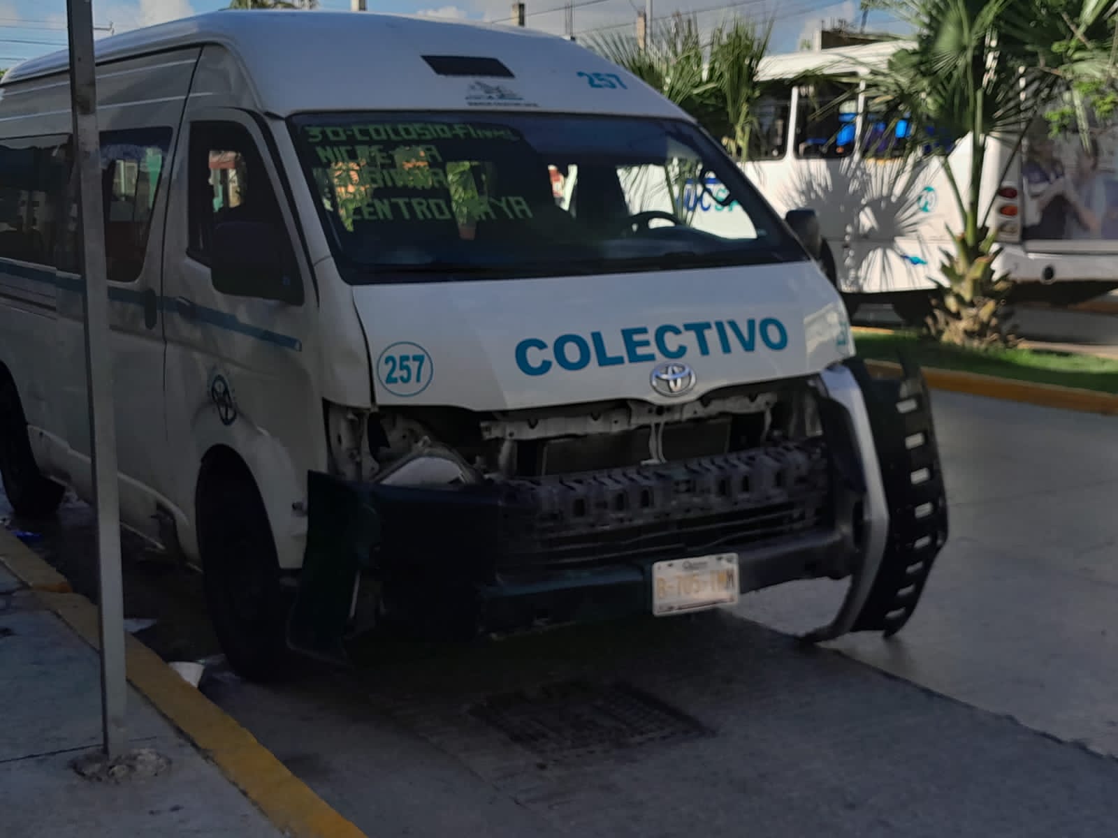 El conductor de un vehículo de alquiler chocó esta mañana con una combi de transporte público, esto en el cruce de la calle 92 con la avenida 30, en la colonia Luis Donaldo Colosio. No hubo lesionados.