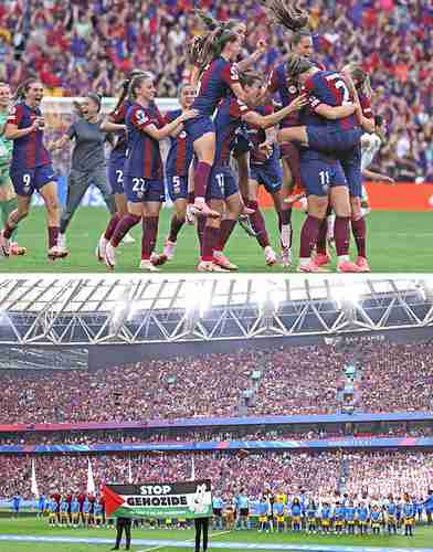 La Catedral del futbol español y sus 50 mil 827 aficionados pre-sentes que depararon un nuevo récord de asistencia en una final femenina de la Liga de Campeones, en su mayor parte catalanes, asistieron en medio de un ambiente de efervescencia azulgrana a una nueva coronación de las jugadoras dirigidas por Jonatan Giráldez, quien se despide del banquillo del Barça con un poker de títulos esta temporada (Liga, Copa de la Reina, Supercopa de España y Champions).