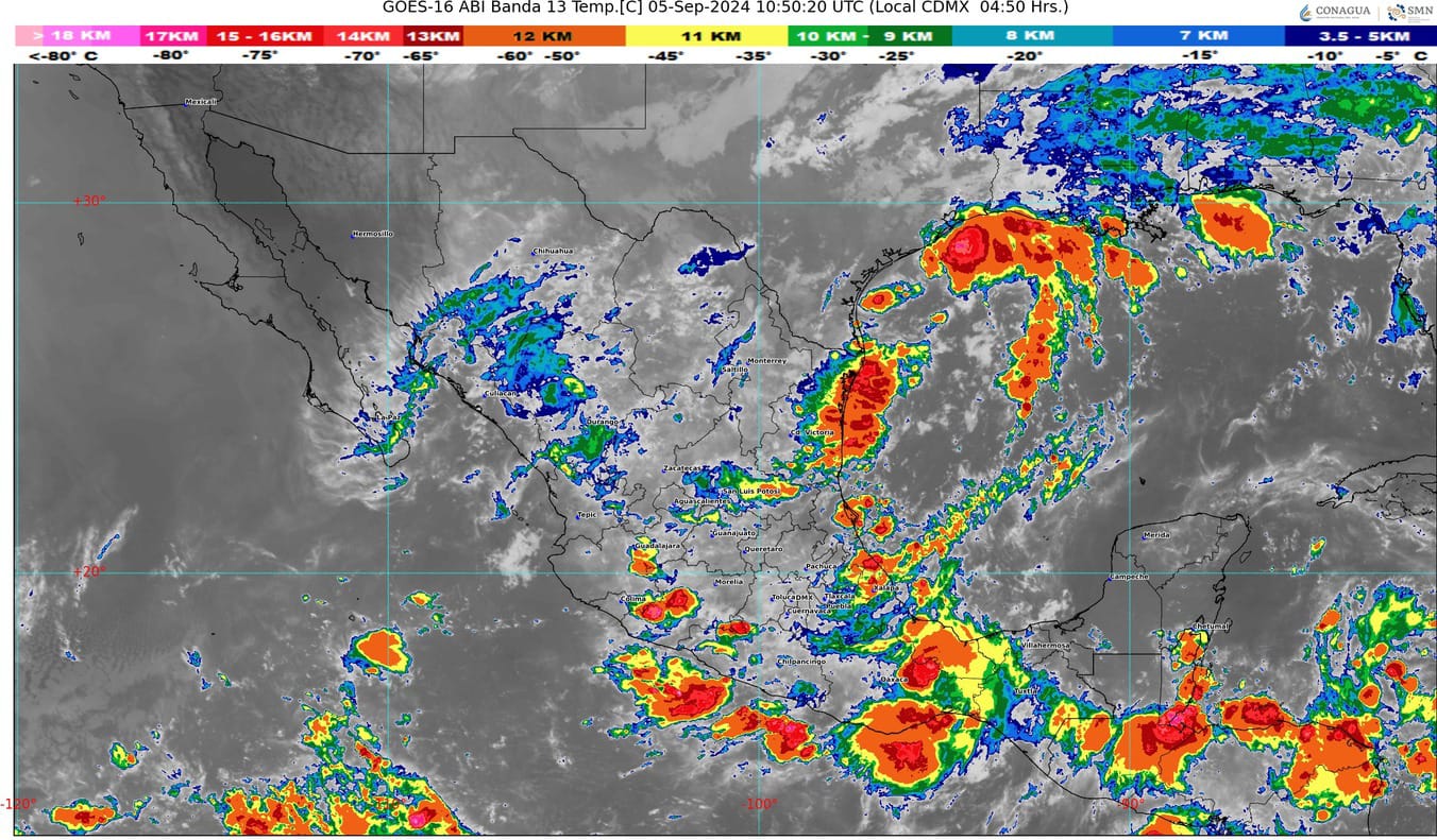 Un canal de baja presión sobre el interior del país, y el ingreso de aire húmedo del golfo de México y océano Pacífico originarán lluvias puntuales intensas en Veracruz, Oaxaca, Puebla y Guerrero; puntuales muy fuertes en Hidalgo, Querétaro, Michoacán, Colima, Jalisco, Nayarit y Zacatecas; y puntuales fuertes en Tlaxcala, Morelos, Ciudad de México, Estado de México, Guanajuato y Aguascalientes.