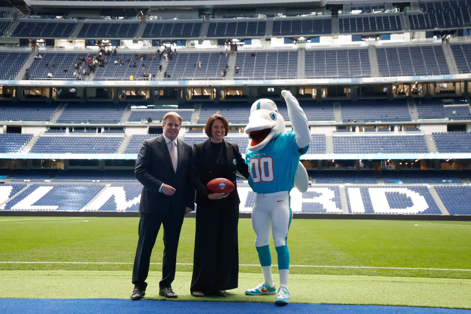 El anuncio de que los Dolphins serán uno de los dos equipos de la liga profesional de futbol americano que se enfrentarán -por primera vez en España- en el Bernabéu tuvo lugar este viernes en el citado estadio madrileño, en un acto al que asistieron, entre otros, Brett Gosper, director de la NFL en Europa y Asia-Pacífico; Pri Shumate, vicepresidenta de los Miami Dolphins; y Florentino Pérez, presidente del Real Madrid.