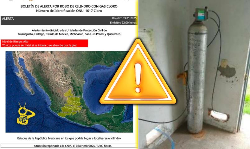 #NACIONAL | El Gobierno mexicano emitió este sábado una alerta en seis estados por el robo de un cilindro de gas cloro, elemento altamente tóxico que puede ser fatal si se inhala o se absorbe por la piel e hizo un llamado a los ciudadanos a alejarse del mismo en caso de encontrarlo.