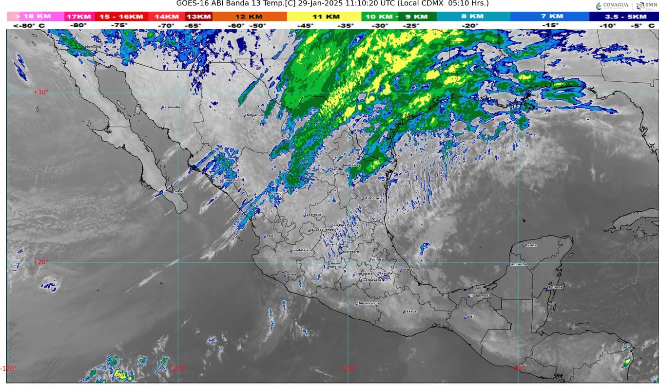 Simultáneamente, se prevé ambiente muy frío a gélido en sierras de Baja California, Sonora, Chihuahua y Durango, así como posible caída de nieve o aguanieve en las sierras de Sonora y del noroeste de Chihuahua y de lluvia engelante en sierras del norte de Baja California.