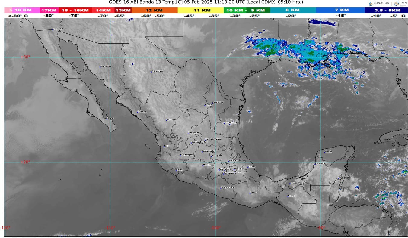 Por otra parte, una circulación anticiclónica en niveles medios de la atmósfera mantendrá ambiente caluroso en estados del litoral del Pacífico y zonas de la Mesa del Norte y la Mesa Central.