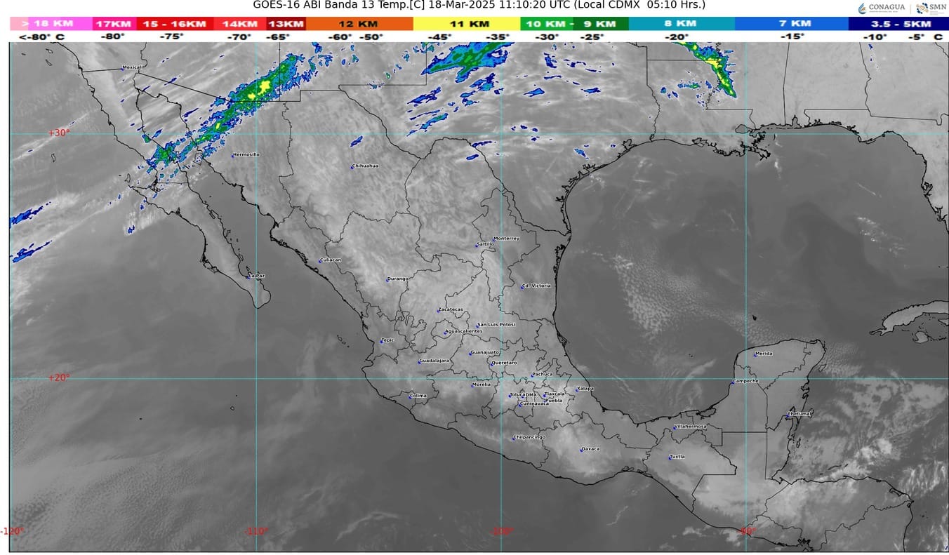 Por otra parte, la masa de aire asociada con el frente número 35 modificará sus características térmicas, debido a un evento de surada (viento de componente sur) en Nuevo León, Tamaulipas y Veracruz.