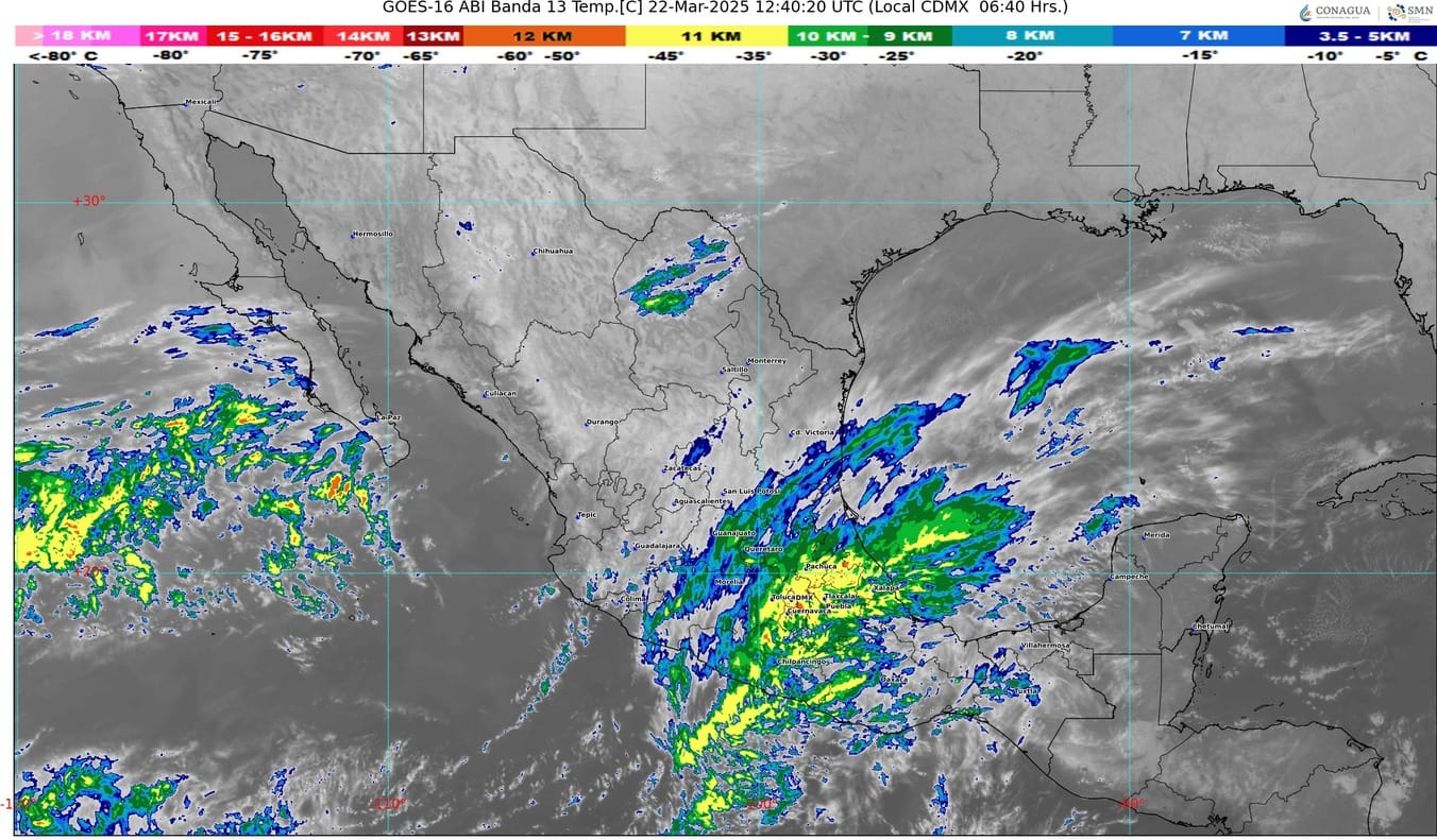 El escaso contenido de vapor de agua mantendrá baja probabilidad de lluvia y ambiente vespertino cálido a caluroso sobre gran parte de la República Mexicana, con temperaturas máximas muy calurosas superiores a 40 grados centígrados en zonas de Sonora, Michoacán, Guerrero, Oaxaca y Chiapas.
