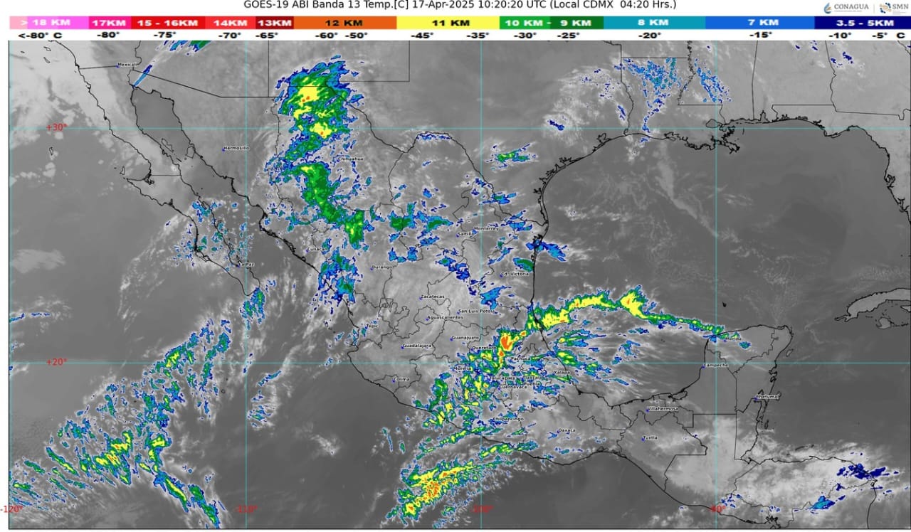 Una circulación anticiclónica en niveles medios de la atmósfera y el bajo contenido de vapor de agua, mantendrán baja probabilidad de lluvias y ambiente caluroso a muy caluroso en gran parte de la República Mexicana, con temperaturas máximas de 40 a 45 grados centígrados en Chihuahua (suroeste), Sinaloa, Nuevo León (oriente), Tamaulipas, Guerrero, Oaxaca (istmo) y Chiapas (costa).