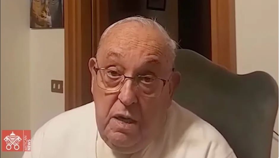 La grabación, de un minuto de duración, se realizó el 08 de enero dentro de una iniciativa de diálogo entre jóvenes y adultos, lo muestra en su residencia de la Casa Santa Marta ataviado con un jersey blanco de cuello de pico.