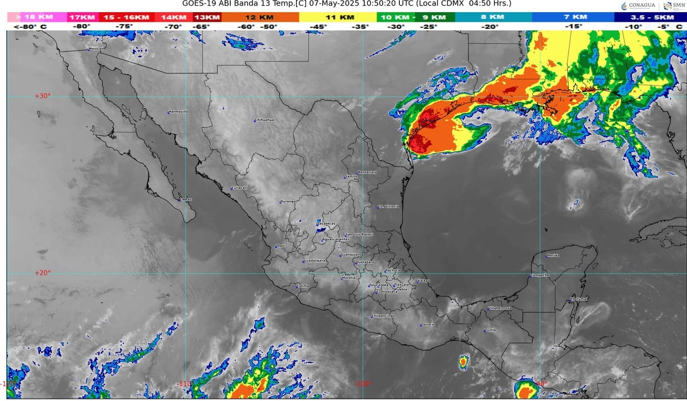 Finalmente, una circulación anticiclónica en niveles medios de la atmósfera mantendrá el ambiente caluroso a muy caluroso sobre el territorio mexicano, prevaleciendo la onda de calor en zonas de Jalisco (centro, suroeste y sur), Colima, Michoacán, Guerrero, Oaxaca, Chiapas (norte, noroeste y oeste), Nuevo León (sur), Tamaulipas (suroeste), San Luis Potosí (norte, centro y sur), Guanajuato (norte, noreste y sur), Querétaro, Hidalgo (norte y oeste), Puebla (norte, sur y suroeste), Tlaxcala, Estado de México (suroeste), Ciudad de México, Morelos, Veracruz, Tabasco (este), Campeche (oeste y suroeste) y Yucatán (suroeste).