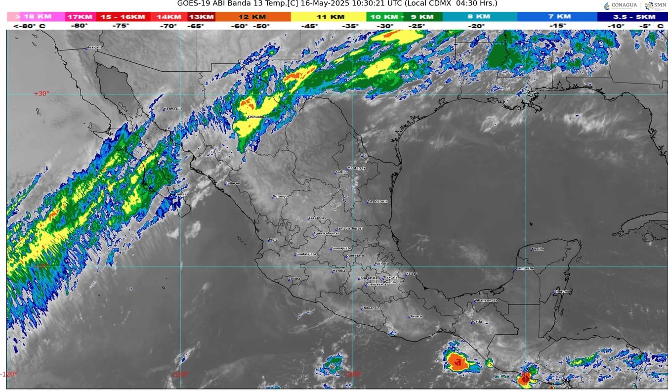 Por otra parte, canales de baja presión, en interacción con el ingreso de humedad del océano Pacífico, golfo de México y mar Caribe, así como con inestabilidad atmosférica, originarán lluvias y chubascos vespertinos con descargas eléctricas y posible caída de granizo sobre el occidente, centro, sur y sureste mexicano, incluida la península de Yucatán, así como lluvias puntuales fuertes en Chiapas.