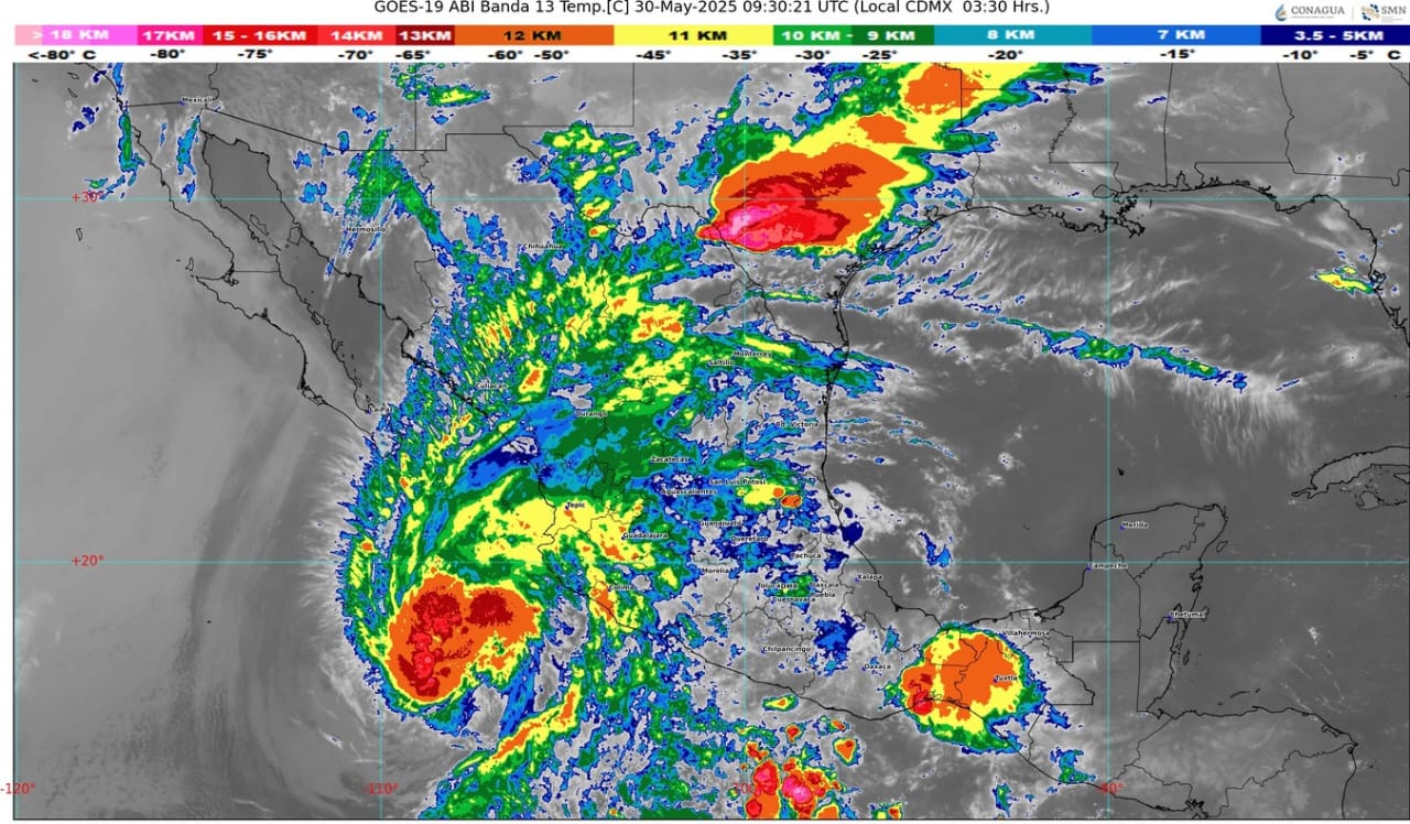 Una circulación ciclónica en niveles medios y altos de la atmósfera asociada con la corriente en chorro subtropical sobre el noroeste del país, en interacción con inestabilidad atmosférica, con un nuevo frente frío (fuera de temporada) que se extenderá sobre la frontera norte del país, y con un canal de baja presión sobre la Mesa del Norte, ocasionarán rachas fuertes de viento, así como lluvias fuertes a muy fuertes en el norte del territorio mexicano, además de lluvias puntuales intensas en Coahuila y Nuevo León.