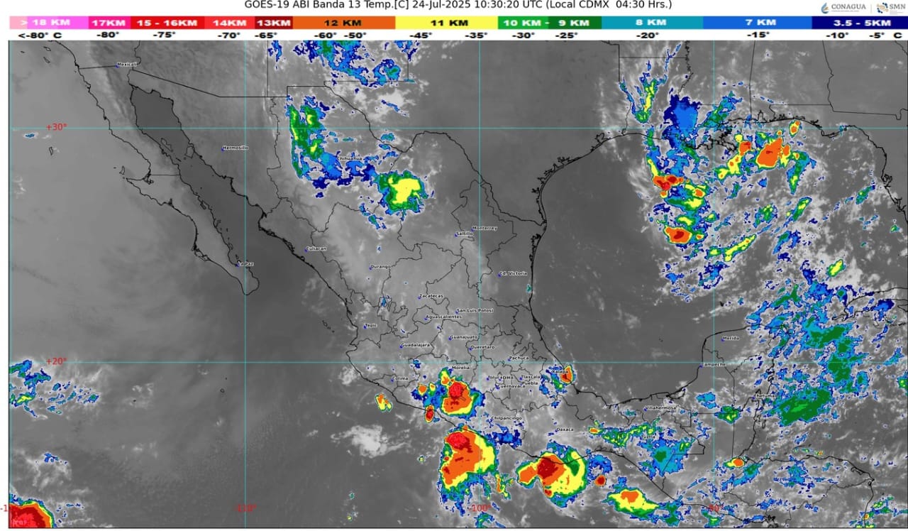 El ingreso de aire húmedo del golfo de México y océano Pacífico, en interacción con un canal de baja presión sobre la Mesa del Norte y con inestabilidad atmosférica en el occidente del país, ocasionarán lluvias puntuales muy fuertes en Michoacán y Guerrero; puntuales fuertes en Veracruz, Puebla, Morelos, Ciudad de México, Estado de México, Colima y Jalisco; intervalos de chubascos en Tlaxcala e Hidalgo; y lluvias aisladas en zonas de Querétaro, Guanajuato, Aguascalientes, Zacatecas, San Luis Potosí, Tamaulipas, Nuevo León y Coahuila.