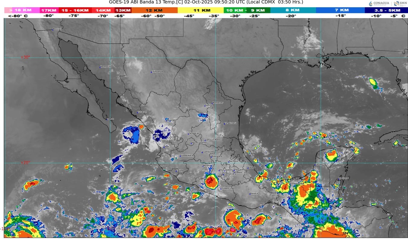 Canales de baja presión sobre el interior del país, inestabilidad atmosférica y el ingreso de aire húmedo del océano Pacífico y golfo de México, originarán lluvias puntuales fuertes en Puebla, Estado de México, Hidalgo y San Luis Potosí; intervalos de chubascos en Morelos, Tlaxcala, Ciudad de México, Querétaro, Tamaulipas y Durango; así como lluvias aisladas en zonas de Guanajuato, Zacatecas, Nuevo León, Chihuahua y Sonora.