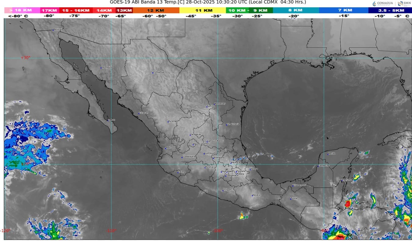 Por su parte, canales de baja presión sobre el interior del territorio nacional, en combinación con el ingreso de aire húmedo del océano Pacífico, golfo de México y mar Caribe, originarán intervalos de chubascos en estados del occidente, centro, oriente, sur y sureste de la República Mexicana, incluyendo la península de Yucatán.